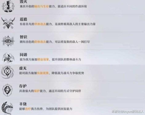 簡介:共有7個職業(yè),分別是毀滅(攻防兼?zhèn)洌搏C(單攻),智識(群攻),同諧(增益輔助),虛無(減益輔助),存護(坦克職業(yè)),豐饒(奶媽)。