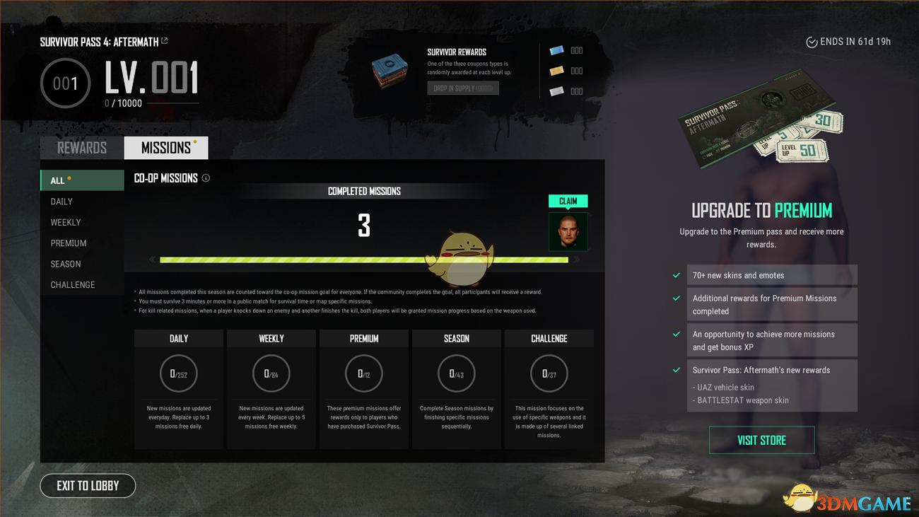9.99 美元可進(jìn)行解鎖,共有三種升級(jí)卡(直升):分別為5 級(jí)券——4.99美元、20級(jí)券——17.99美元——、與30級(jí)券——24.99美元,每種直升卡都可重復(fù)購(gòu)買多次!只要玩家購(gòu)買通行證,就會(huì)免費(fèi)獲得最新吉普車皮膚?!督^地求生》游戲新通行證包括內(nèi)容:全新的舞蹈、妝容、發(fā)型皮膚與各種槍械皮膚獎(jiǎng)勵(lì)!吉普車也會(huì)有新皮膚哦!《絕地求生》游戲的第四個(gè)通行證——余波。