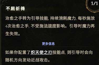 點(diǎn)出不屈祈禱和熾天使之刃節(jié)點(diǎn)后,治愈之手轉(zhuǎn)化為引導(dǎo)近戰(zhàn)形態(tài),每秒4次擊中,不受攻速影響。(近戰(zhàn)形態(tài)不需要?dú)w途節(jié)點(diǎn)也能治療自己)