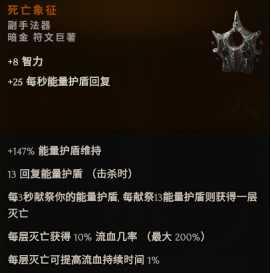 在天賦樹、治愈之手技能樹和裝備的治療效率支持下,治愈之手每3S可以給自身提供2W6左右的護(hù)盾。被死亡象征獻(xiàn)祭后可以拿到2000層的滅亡(注意,滅亡提供的流血幾率有上限,流血持續(xù)時(shí)間沒有上限)。