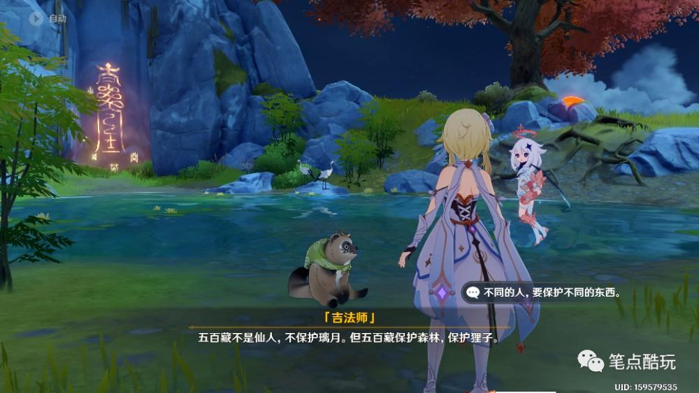 2,之后一段對話,主要給吉法師講課:比如理水疊山真君的用琥珀困住壞人,討論“仙人守護璃月”與“五百藏守護鎮(zhèn)守之森”,等等,旅行者和派蒙又提到在璃月經歷送仙典儀的趣事。