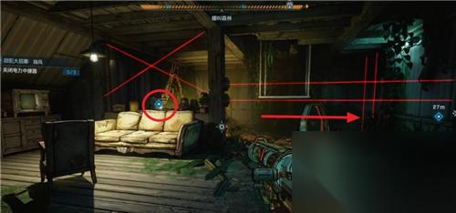 解決掉又一波出現(xiàn)的敵人,用槍射擊有紅色高亮的炸彈開一個(gè)洞,從天花板下去。