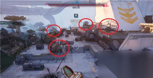 屋頂先把敵人全部干掉,然后注意下圖四個(gè)紅圈所示的裝置,我們需要把這些裝置全破壞掉。