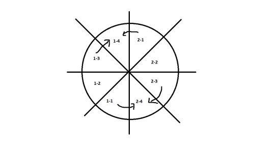 規(guī)定站位1隊左邊,2隊右邊。1-1站7點,1-2站9點,1-3站11點,1-4站12點,2-1站1點,2-2站3點,2-3站5點,2-4站6點。