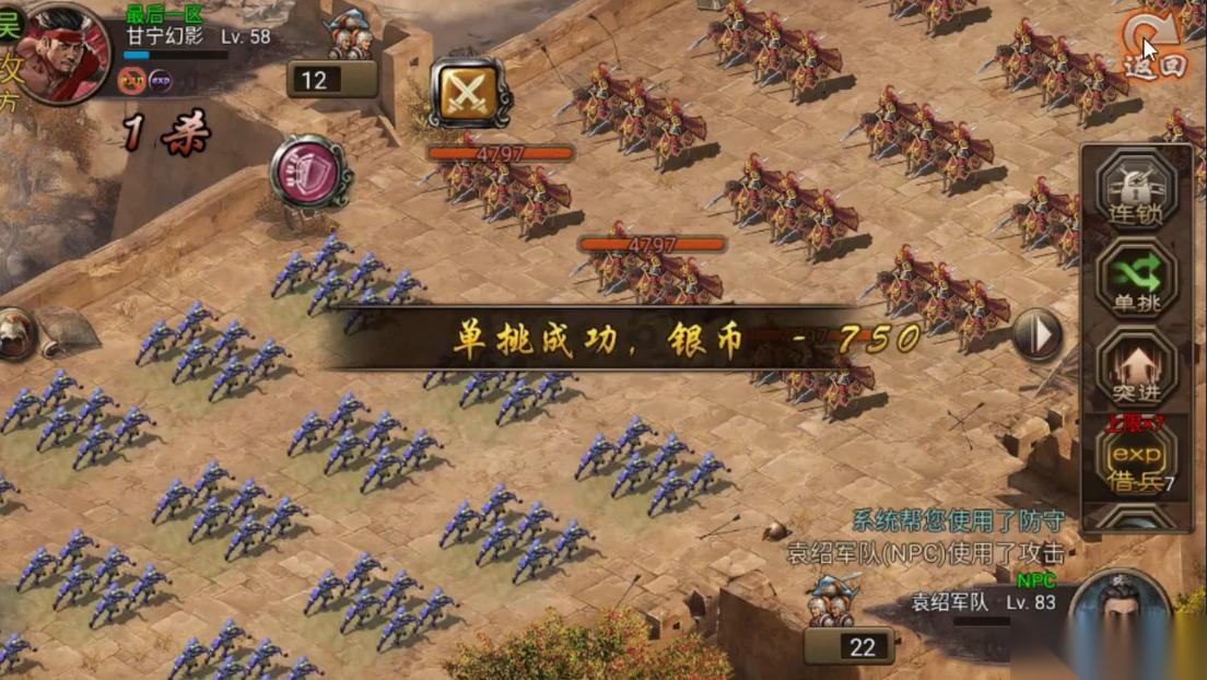 開局先用甘寧進大營北郊,這里有4隊兵,進去后立刻刷1個影子幫忙分擔壓力。其他武將跟進單挑,打完立刻撤退補滿兵再進,甘寧通常打完一隊就會陣亡,記得及時補兵重新進場。大營北郊清完后,馬上用馬超突進西平原,這里有12隊兵,建議刷4個影子創(chuàng)造單挑機會,后續(xù)武將快速進場輪流單挑,每打完一輪就撤退補兵,保持兵力充足。