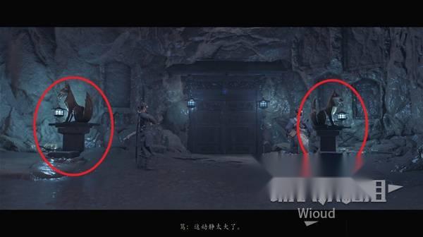 先和兩側(cè)的狐貍雕像互動(dòng),等他們的燈變成藍(lán)色,將他們的朝向改成下圖樣式,開門觸發(fā)劇情。