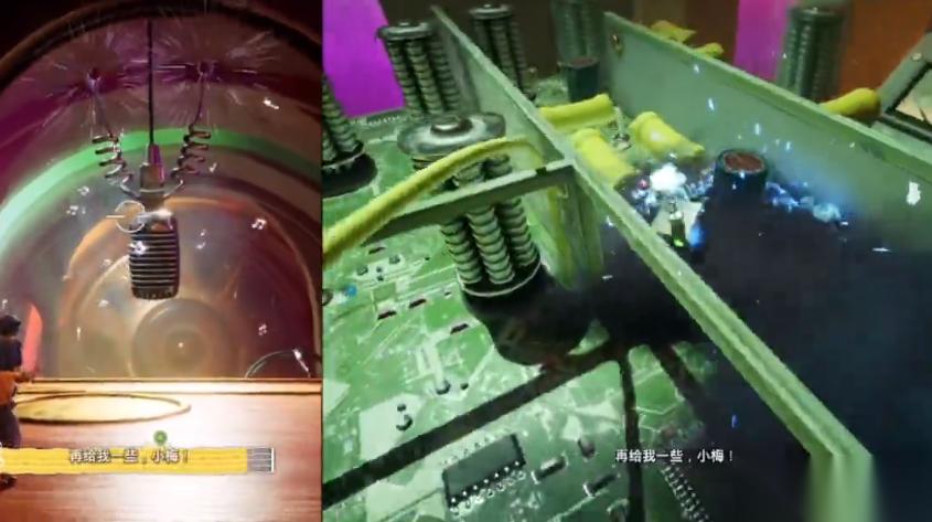 通過簡單的甩鉤子和跳躍來到下一個門口,進入粉色燈光的房間??频险驹邴溈孙L前面的紅白地板上,小梅對準麥克風大喊,紅白地板打開,科迪掉落下去。當科迪站在音響上時小梅再次喊叫令科迪飛到對面,接著科迪拿著揚聲器往前走,小梅不斷使用技能大聲喊叫,把前方路障全部炸碎??频蟻淼奖M頭把揚聲器放在紅色的圓點處,對準右側(cè)的麥克風,然后科迪把可以移動的推鍵移動到最前端,小梅大喊一聲炸開。來到第二個環(huán)節(jié)尋找麥克風,前面是激光墻,需要科迪舉起唱片當盾,然后小梅先經(jīng)過。前方是四個不同顏色的麥克風,科迪站在最前面有四個顏色方向的方塊上,這里需要小梅叫喊對應(yīng)顏色的麥克風讓科迪腳下的方塊穿過紅色的區(qū)域來到對面綠色的格子處。