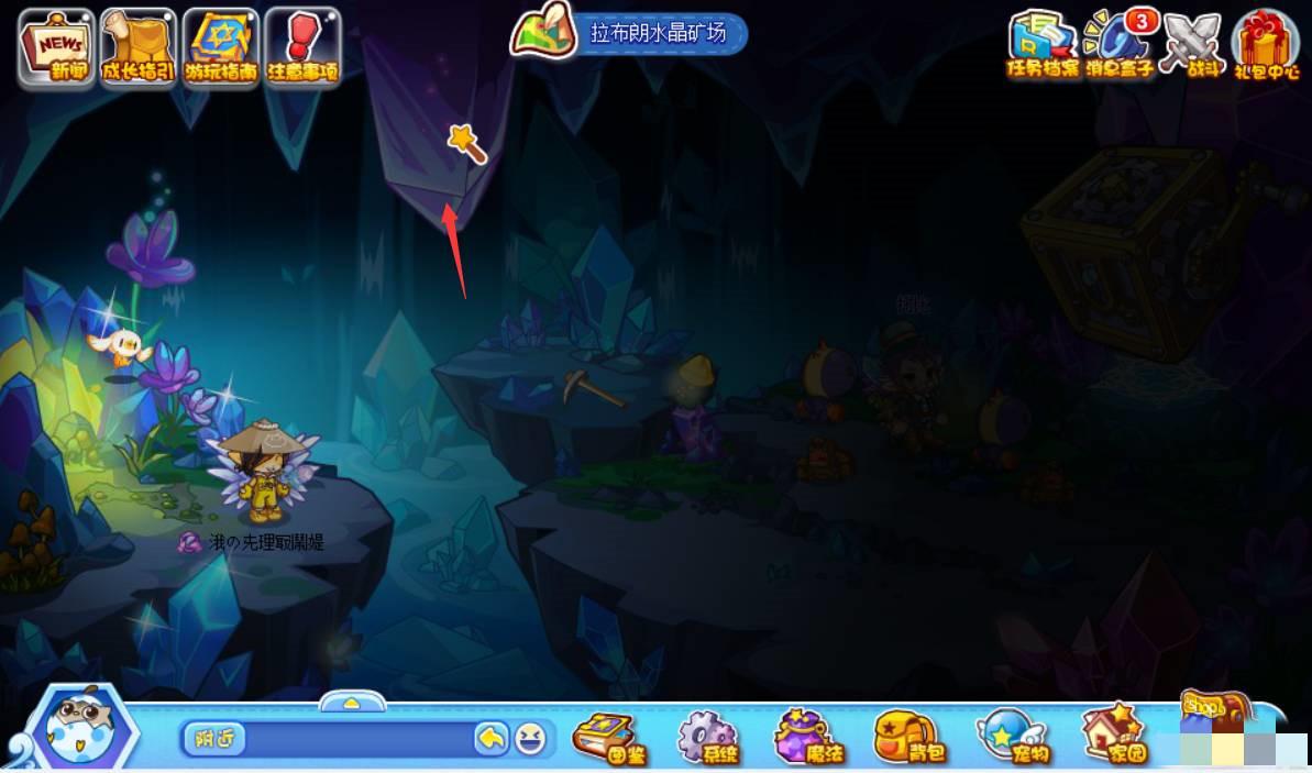 首先需要來到拉布朗水晶礦這里,然后點擊魔法;選擇星星魔法,用星星魔法打掉上方垂下來的石頭;石頭會掉下來,鋪好道路,接著走到對面去,這個時候屏幕中間有一個可以用魔法點亮的燈,用星星魔法將燈點亮;等點亮完成后,就可以看到拉布朗水晶礦場的全貌了。