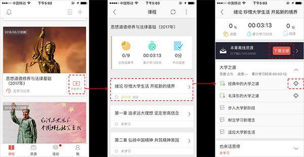 在課程菜單下,學(xué)生可以看到已激活的所有課程。點(diǎn)擊課程封面或者“開(kāi)始學(xué)習(xí)”圖標(biāo)可以查看課程目錄、課程的累計(jì)學(xué)習(xí)時(shí)間和平均成績(jī)等。點(diǎn)擊章名稱,進(jìn)入章目錄頁(yè)面,再點(diǎn)擊“下載全部”按鈕可下載本章所有資源;