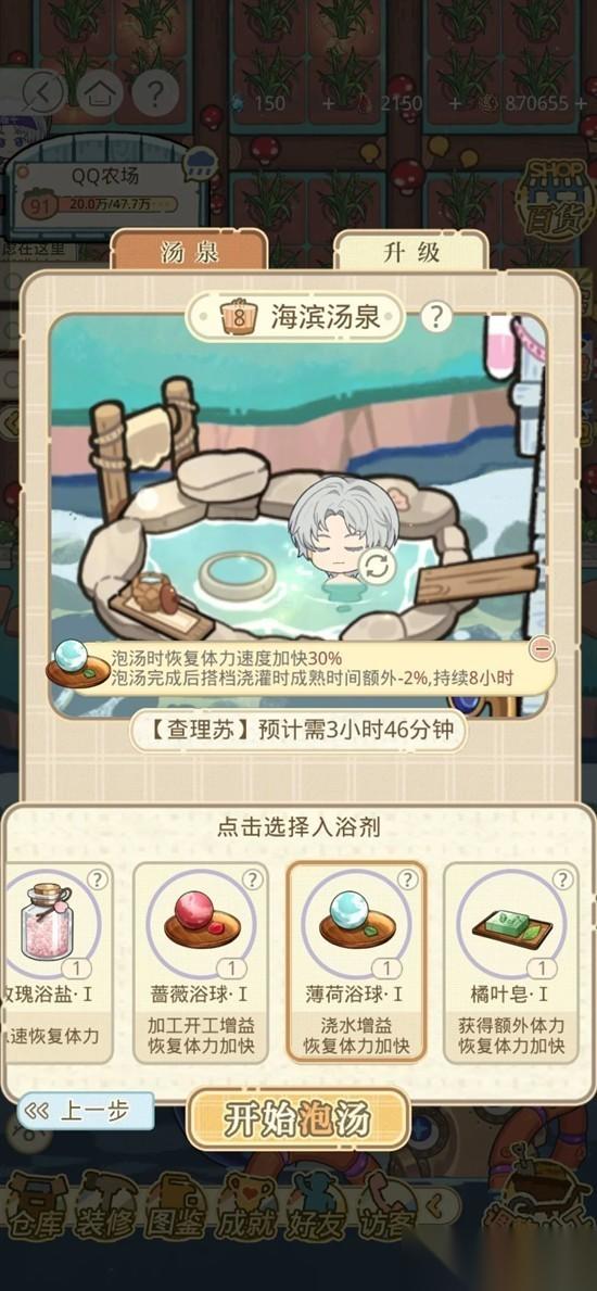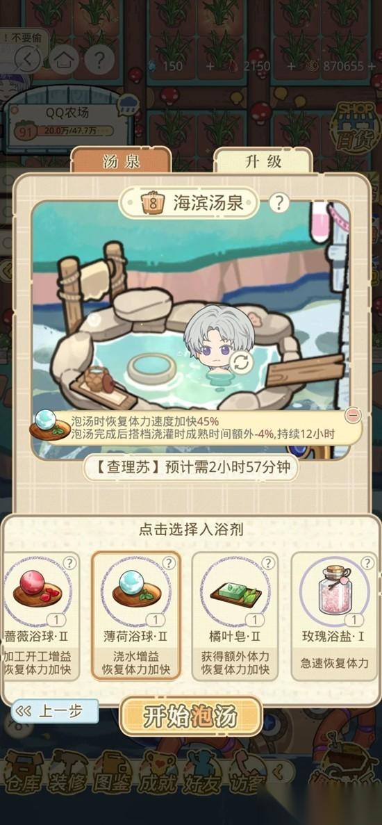 男主泡湯泉時(shí)不能做其他工作,泡完需要手動拎回家。提前離開不返還入浴劑,用完可以用農(nóng)場幣買(Ⅰ級1w農(nóng)場幣,Ⅱ級2w農(nóng)場幣)