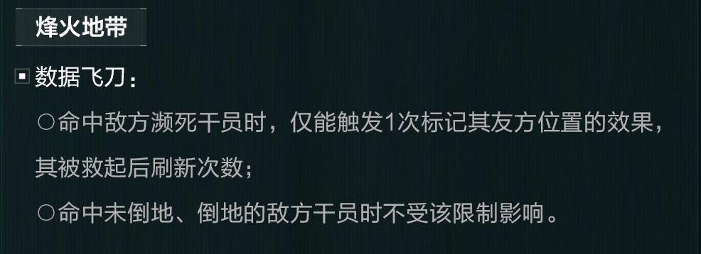 1、命中敵方瀕死干員時,僅能觸發(fā)1次標(biāo)記其友方位置的效果其被救起后刷新次數(shù)。